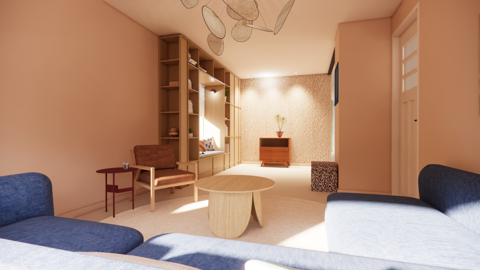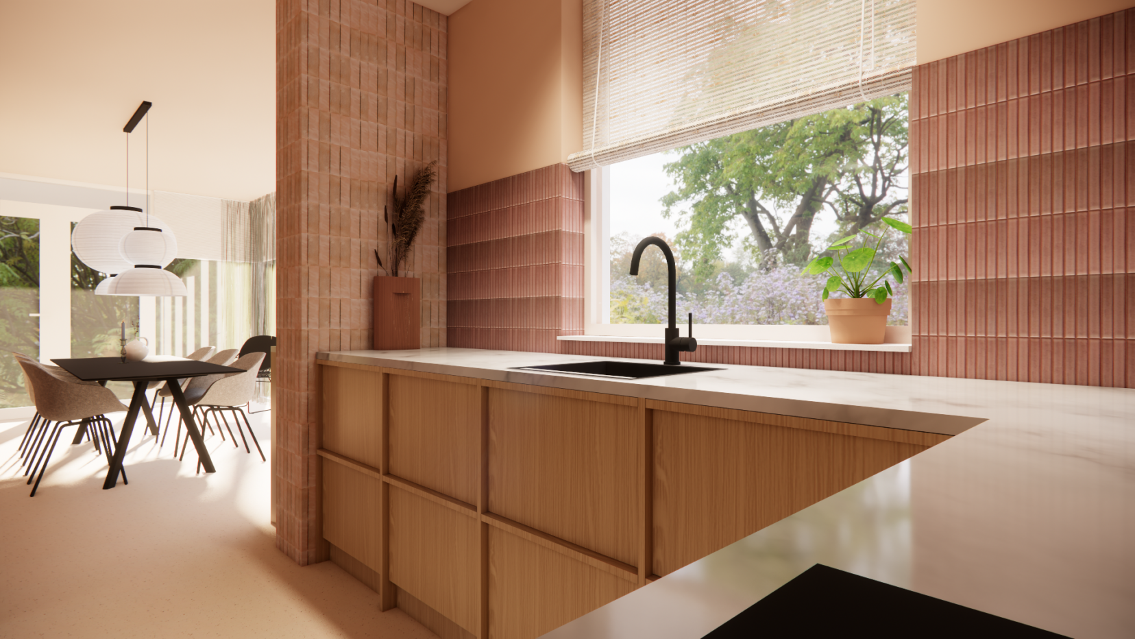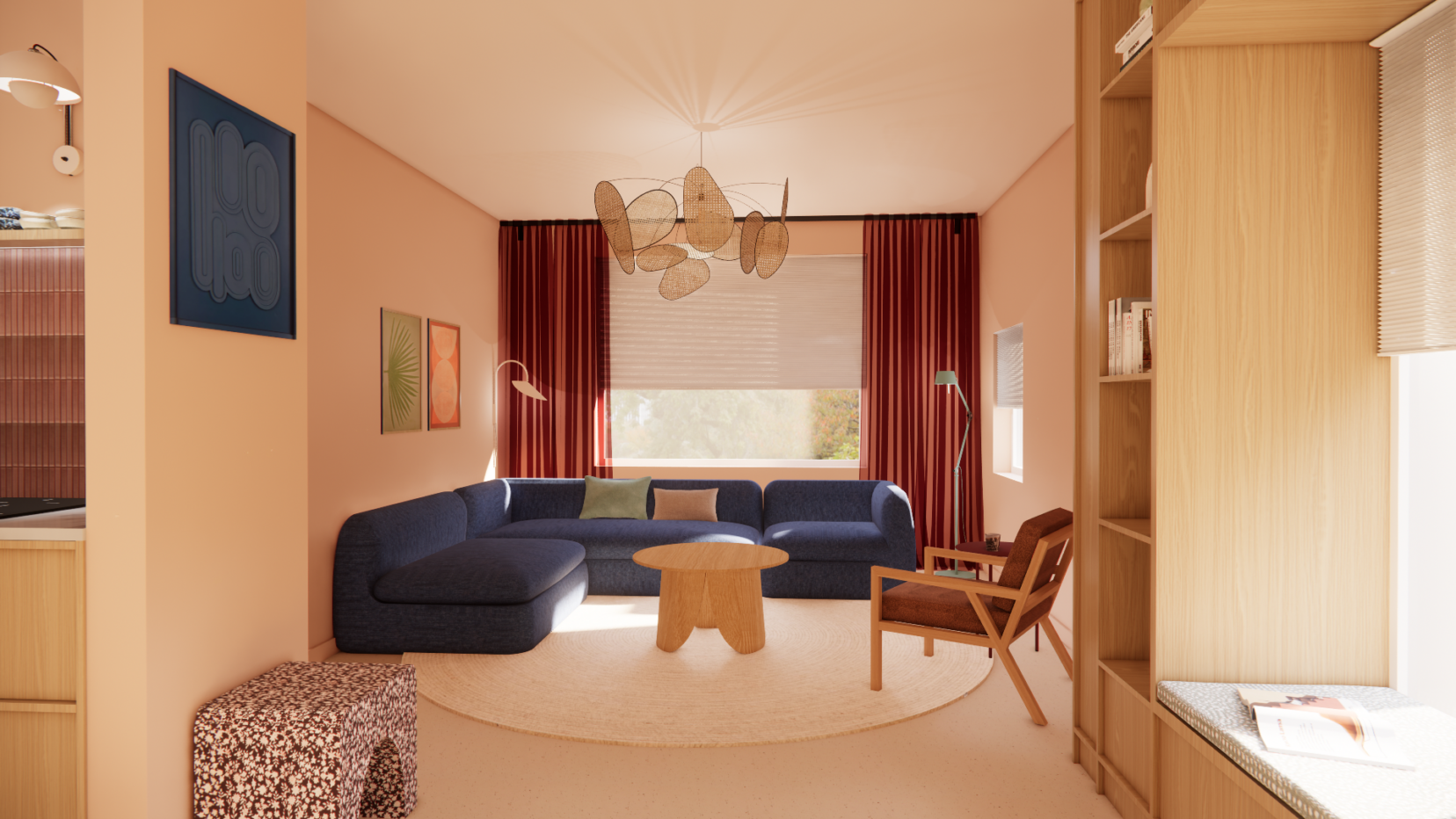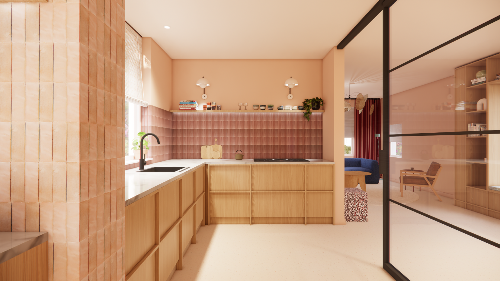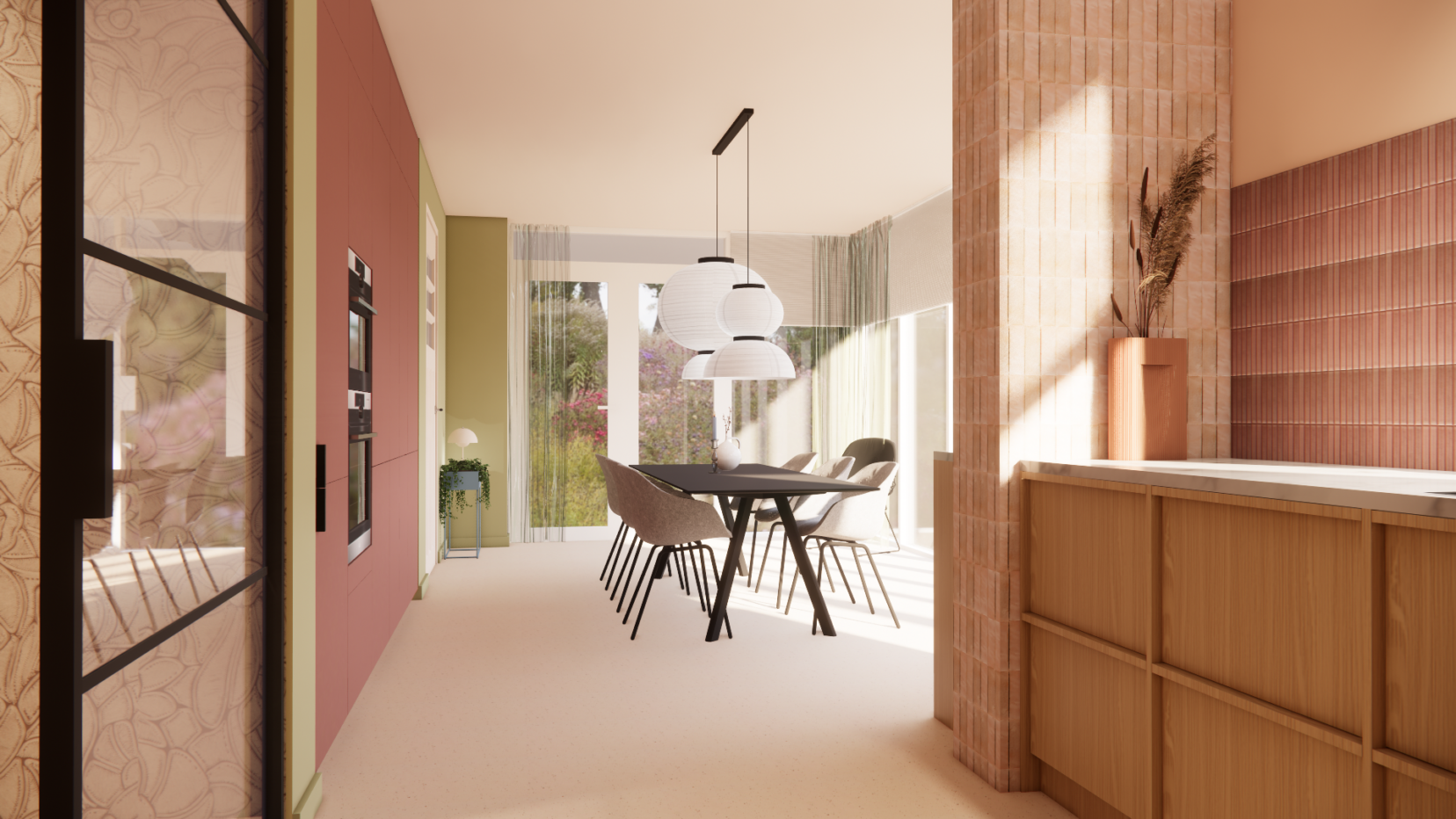 Voor dit gezin mocht ik de hele benedenverdieping ontwerpen: de keuken, eetkamer en woonkamer. De stijl die ik in dit project toepaste, is kleurrijk, heeft elementen van de vintage stijl maar heeft tegelijkertijd ook kenmerken van de japandi stijl, maar dan wel vol warmte. En eigenlijk zit er ook nog een vleugje Mediterraans in de mix. Kortom: het is iets unieks dat helemaal bij dit gezin en hun nieuwe thuis past. In het kleurenplan staan warme terra / roze / rode kleuren centraal, in combinatie met groen in zachte en donkerdere tinten en een blauw accent. Wit maakt plaats voor een neutrale heel subtiel lichtroze tint. Donkerblauw komt als accent terug, in de bank en in accessoires.