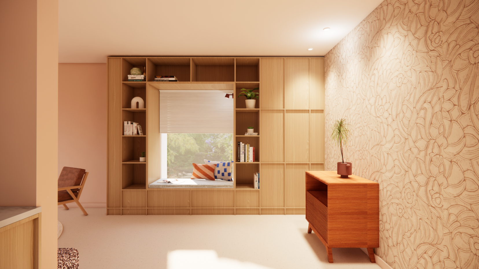 Ik adviseerde een voor een mix van warme, natuurlijke materialen en mooie structuren voor meer gelaagdheid. De nieuwe keuken kreeg met licht eiken fronten van Studio Fedde een prachtige Japandi uitstraling. Ook mocht ik in dit project mooi maatwerk toepassen. Zoals een grote wandkast in de keuken en een wandkast met nis rondom het raam voor in de woonkamer.
